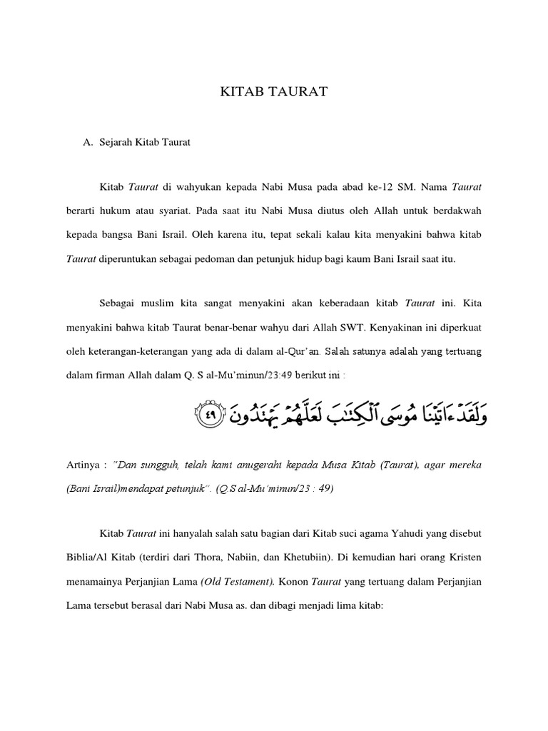 02042020 Menurut ajaran Islam bahwa Kitab Taurat adalah kitab yang diturunkan Allah SWT kepada Nabi Musa as untuk Bani Israil atau kaum Yahudi agar mereka senantiasa berada dalam jalan kebenaran. Kitab Taurat diturunkan kepada Nabi Musa AS. Nabi Isa as Quran Daftar-pertempuran-pada-perang-dunia-i Makalah.
