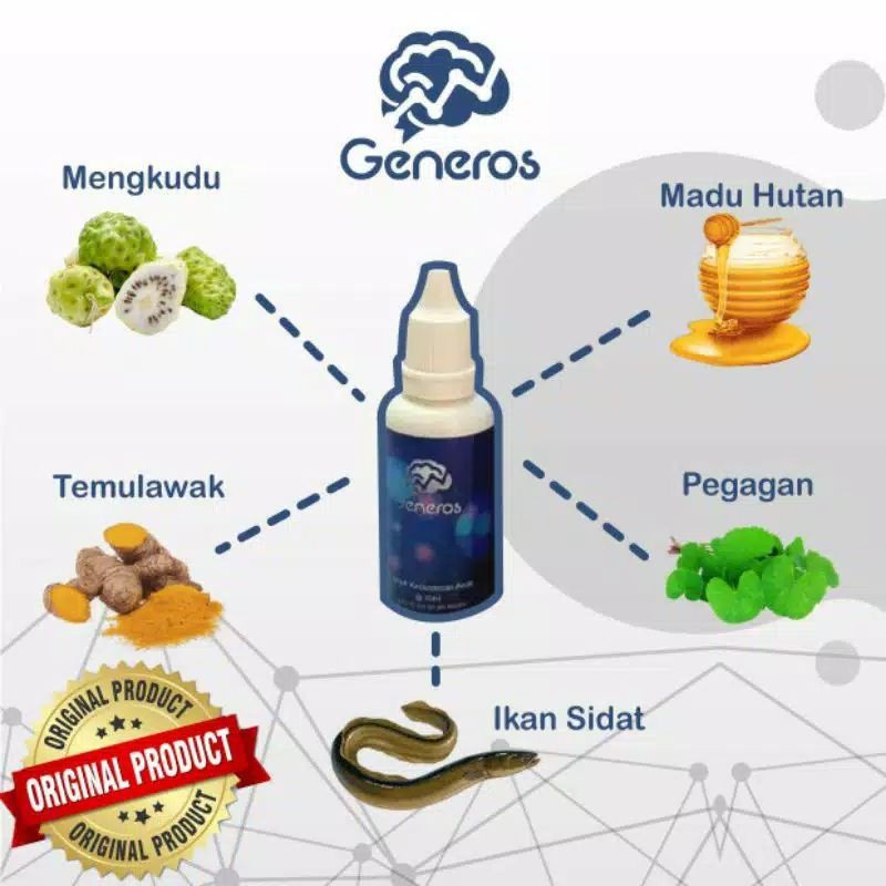 Generos secara empiris mampu menjadi nutrisi dan menangkal gangguan radiasi bebas yang berbahaya bagi otak. Madu Hutan Mengkudu Pegagangan Protein Ikan Sidat dan Temulawak. Harga generos sangat terjangkau bila dibandingkan harus terapi.