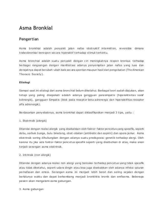 Kegiatan jasmani yang berlebih. 3 Asma campuran Asma campuran merupakan gabungan dari dua jenis asma yang. Penyakit ini 30 diantaranya disebabkan oleh faktor keluarga yaitu jika orang tua menderita asma maka kemungkinan anaknya menderita asma 30.