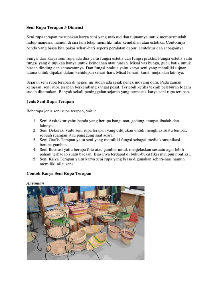 Berikut ini penjelasan dan contoh seni rupa 2 dimensi dan 3 dimensi. Fungsi praktis contohnya kerajinan tas dan mebel.