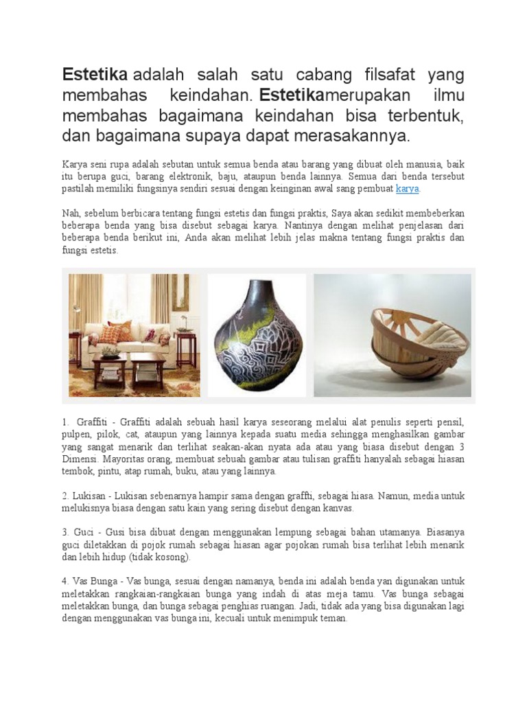 Pengertian Kesimpulan dan Saran. Jadi karya ini lebih cenderung mengutamakan faktor pemakaian dari segi keindahan dan artistiknya. Dalam kehidupan sehari hari kita tidak pernah lepas dari sebuah seni.