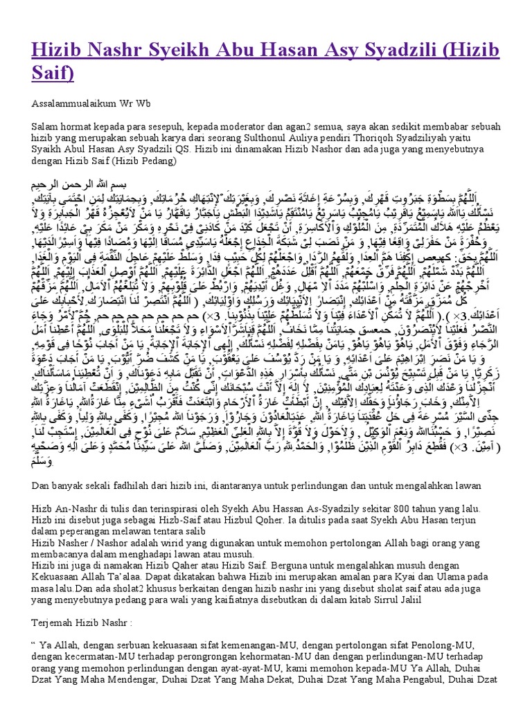 Jangan dibaca Hizib ini dengan tujuan untuk memudharatkan dan menzalimi saudara. Ada yang berbentuk Asmaul Husna nama-nama Allah yang indah shalawat nadzam dan masih banyak lagi lainnya. 26082019 Teks dan tarjamah HIZIB NASHR Amalan Wirid Abu Hasan Asy-Syadzili MANAQIB Biografi Singkat ABUL HASAN AL SYAZILI JALUR KETURUNAN.