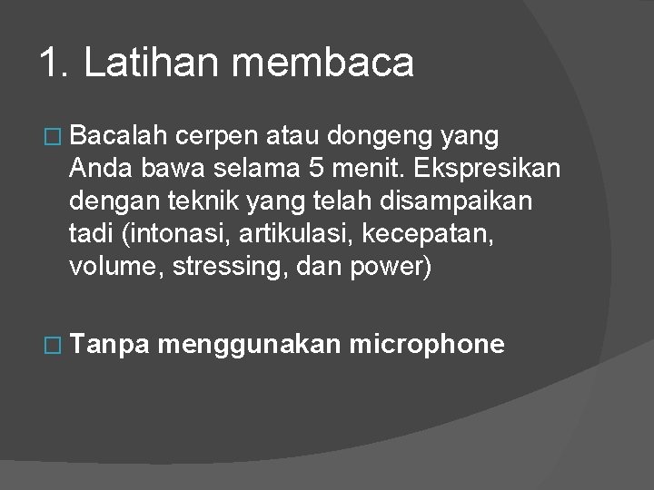 Aktivitas yang menonjol dalam memerankan drama ialah dialog antartokoh monolog ekspresi mimik gerak anggota badan dan perpindahan letak pemain. Bila kita mau mengajar di pagi hari pastikan kita sudah sarapan. Menggunakan suara yang tersendu-sendu saat menangis akan mengundang rasa simpati.