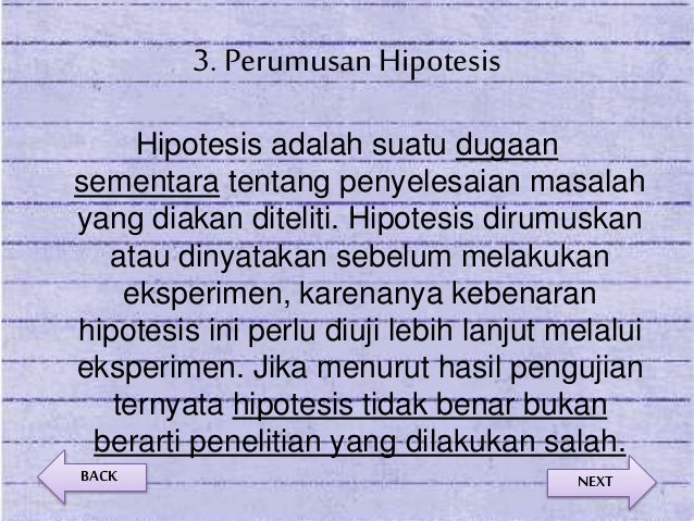 Menentukan dan Merumuskan Masalah Perumusan masalah dilakukan setelah melakukan. Hipotesis dirumuskan atau dinyatakan sebelum penelitian yang seksama atas topik proyek ilmiah dilakukan karenanya kebenaran hipotesis ini perlu diuji lebih lanjut melalui penelitian yang seksama. Metode Ilmiah Rumusan langkah-langkah metode ilmiah yang biasa dilakukan para ilmuwan dalam memecahkan masalah adalah.
