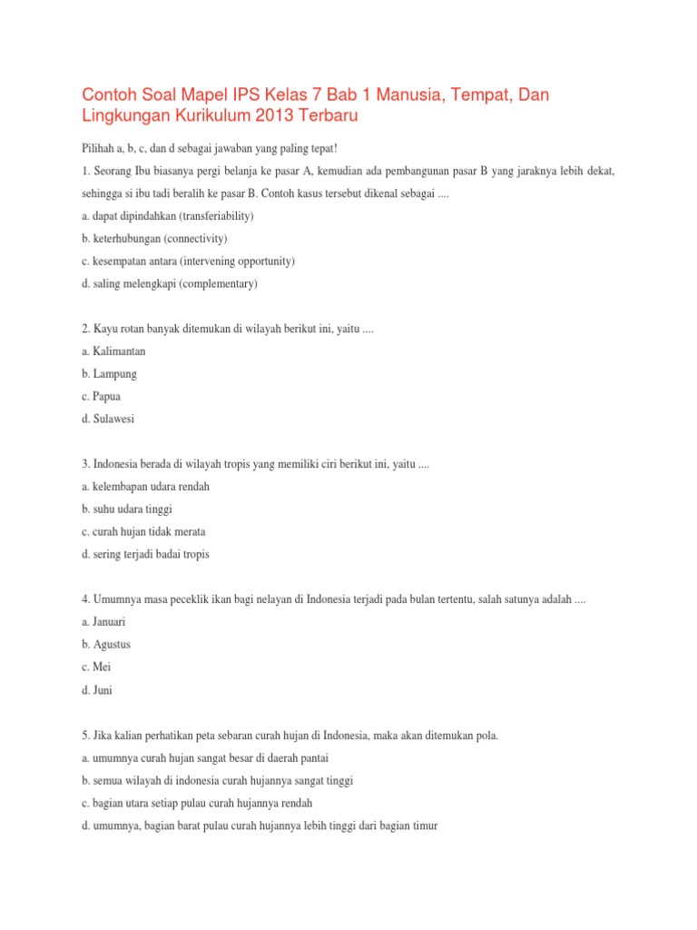 Contoh Soal Mapel Ips Kelas 7 Bab 1 Manusia Tempat Dan Lingkungan Kurikulum 2013 Terbaru
