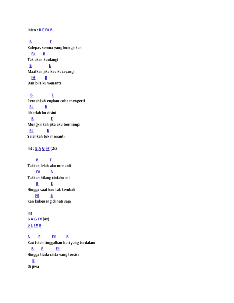 C F Kulepas semua yang ku inginkan G C Tak akan ku ulangi. C F G CC F Kulepas semua yang ku inginkan G C Tak akan ku ulangi C F Maafkan jika kau ku sayangi G C Selasa 20 Juli 2021 2139 Penulis. C F Kulepas semua yang ku inginkan G C Tak akan ku ulangi C F Maafkan jika kau ku sayangi G C Dan bila ku menanti.