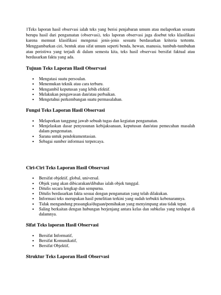 Jenis hasil teks observasi dibagi menjadi 2 yaitu. Analisis teks laporan hasil observasi secara lisan akan menimbulkan saran tanggapan atau pendapat yang penyampaiannya harus memenuhi kaidah. 3 matematika program studi pendidikan guru sekolah dasar jurusan pedagogik fakultas ilmu pendidikan universitas pendidikan indonesia bandung 2012.