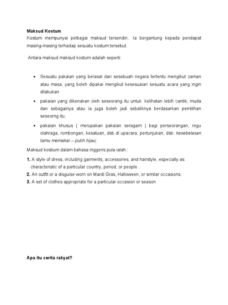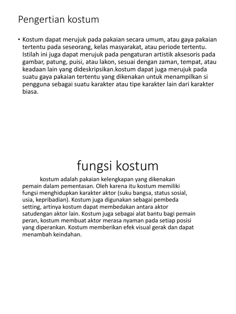 Berikut ini adalah Arti Makna Pengertian Definisi dari kata kostum. Kostum seperti itu sering terdiri atas dua jenis. Oleh karena itu kostum memiliki fungsi menghidupkan karakter aktor suku bangsa usia status sosial Kepribadian.