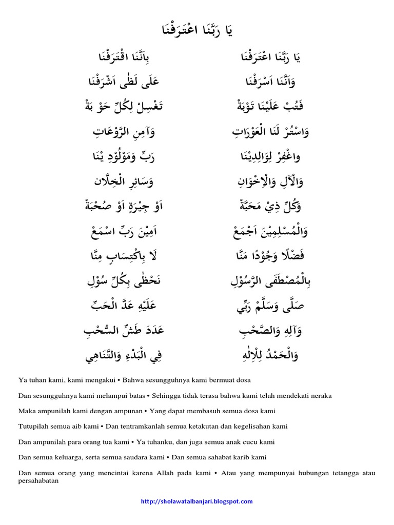 Sholawat ya rabbana tarofna full lirik tanpa musikيا ربنا اعترفنايا ربنا اعترفنا باننا اقترفناYa. 23062020 Ya robbana atarofna bi annan aqtarofnaa Ya Tuhan kami kami mengakui bahwa kami melakukan dosa. YA RABBANA TARAFNAVocal.