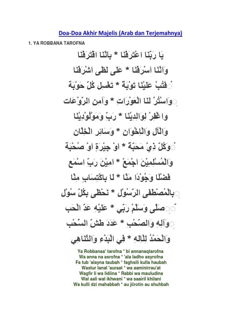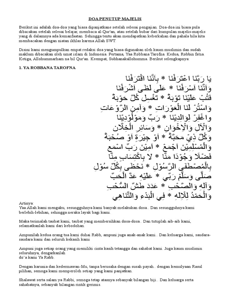 Rikki vam 69projectEditor. 09062020 Doa penutup majelis Ya Robbana Tarofna - Kali ini akan dibahas tentang salah satu doa penting yang biasa dibaca setelah selesai acara sebuah majelis pengajianDoa ini sangat mashur dan umum dibaca di kalangan ahlussunnah wal jamaah sebagai doa penutup majelis dan dibaca paling akhir di sebuah majelis baik majlis taklim majlis sholawat dan majelis-majelis keagamaan. Ya Rabbana Tarafna--Nada Sikkah Ya robbana atarofna bi annan aqtarofnaa Wa annanaa asrofna ala lazho asyrofna 2.