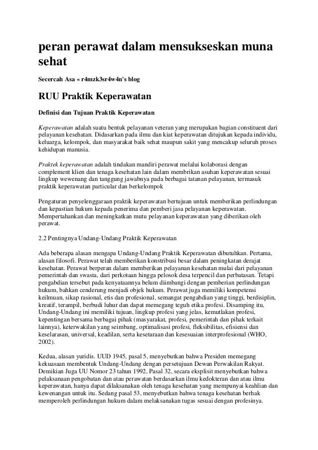 Mengapa perlu Undang-undang Kesehatan 1. Pendahuluan Kesehatan merupakan hak asasi manusia serta modal pembangunan untuk keberlangsungan hidup suatu negara1 Kesehatan sebagai hak asasi manusia harus dilindungi oleh negara dan diberikan kepada seluruh masyarakat tanpa ada diskriminasi. Materi muatan rancangan undang-undang keperawatan menurut Dinas Kesehatan Provinsi Sulawesi Selatan meliputi materi yang terkait dengan standar perawat etika profesi perawat dan pelayanan kesehatan yang bisa dilakukan oleh seorang perawat.