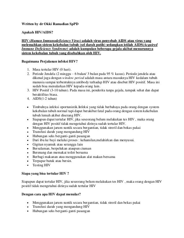 Berikut ini masa antara masuknya HIV ke dalam tubuh manusia sampai terbentuknya antibodi terhadap HIV yang dapat menularkan HIV kepada orang lain kecuali. Antibodi terhadap HIV biasanya baru muncul dalam 3-6 minggu hingga 12 minggu setelah infeksi primer. Cairan tubuh yang tidak bisa menularkan HIV adalah.