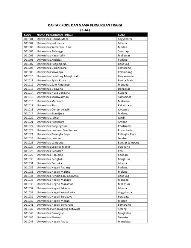 Daftar Kode Dan Nama Perguruan Tinggi Asal Pdf Document