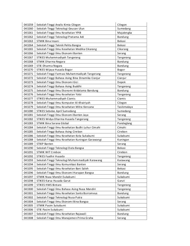 001-002 universitas indonesia jakarta 3. 637 rows Kode Perguruan Tinggi Nama Perguruan Tinggi Alamat.
