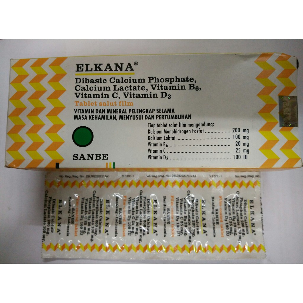 Elkana adalah suplemen dalam bentuk sediaan tablet yang mengandung calcium phosphate Calcium lactate Pyridoxine Vitamin C dan Vitamin D. Dibasic Ca phosphate 200 mg Ca lactate 100 mg Vitamin B6 20 mg Vitamin C 25 mg Vitamin D3 100 iu. Tiap tablet mengandung.