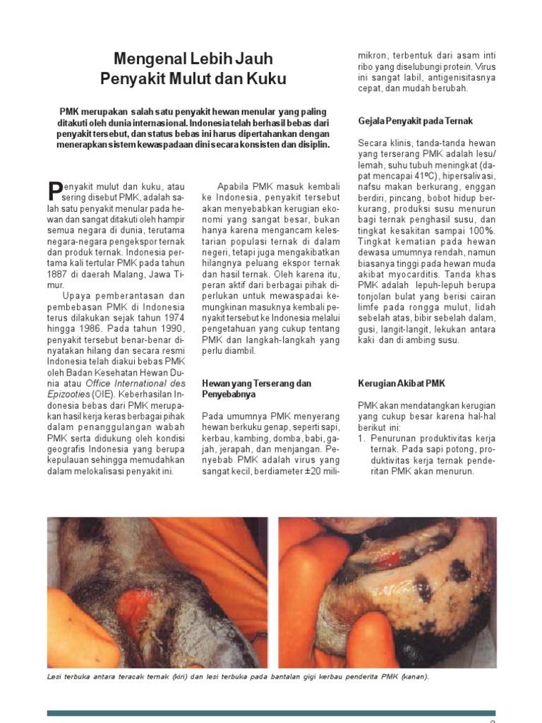Penyakit mulut dan kuku PMK adalah penyakit virus yang sangat menular pada hewan berkuku belahbercabang dua misalnya sapi babi dan domba. Tanda-tanda penyakit ini antara lain. Penyebab penyakit ini disebabkan oleh virus yang menyebar secara langsung melalui kotoran susu air.