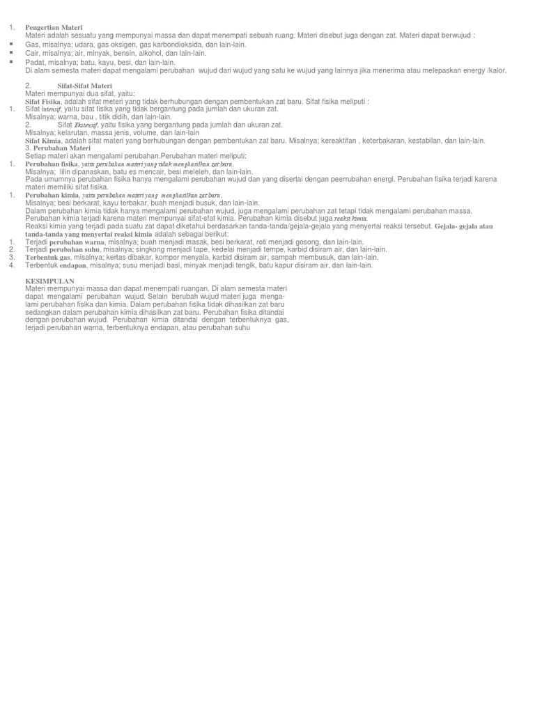 Makhluk hidup dan yang tidak hidup terdiri atas materi. Materi berdasarkan susunan dan sifatnya yaitu zat tunggal dan campuran. Sesuatu yang mempunyai massa dan menempati ruangan disebut.