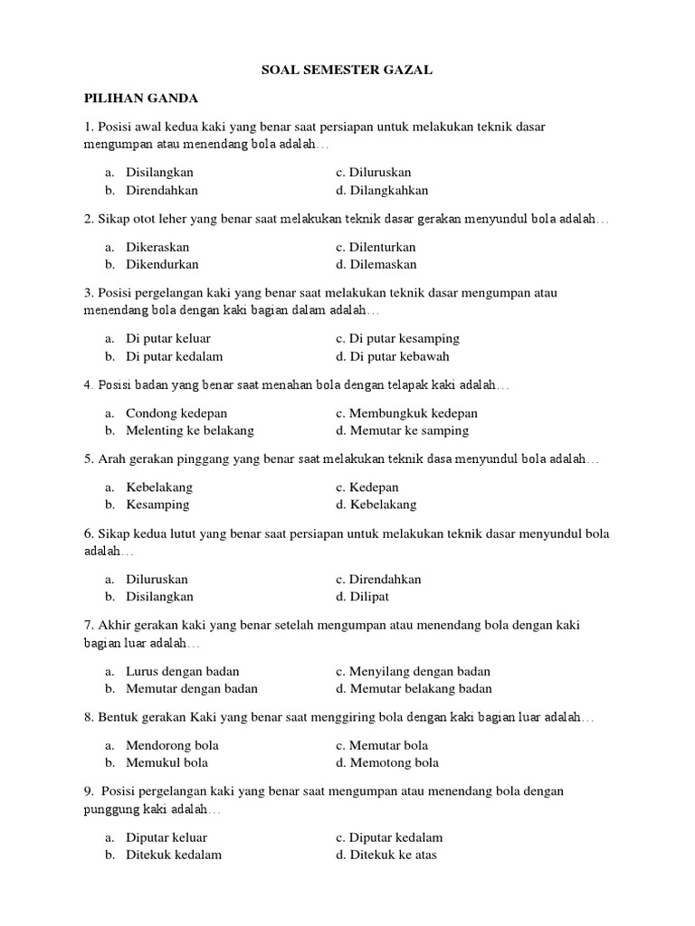 Mengarah ke belakang 4. Mengarah ke atas D. 04042021 Sikap kedua lutut kaki yang benar saat gerakan persiapan untuk melakukan teknik dasar menyundul bola dalam permainan sepak bola adalah C direndahkan.
