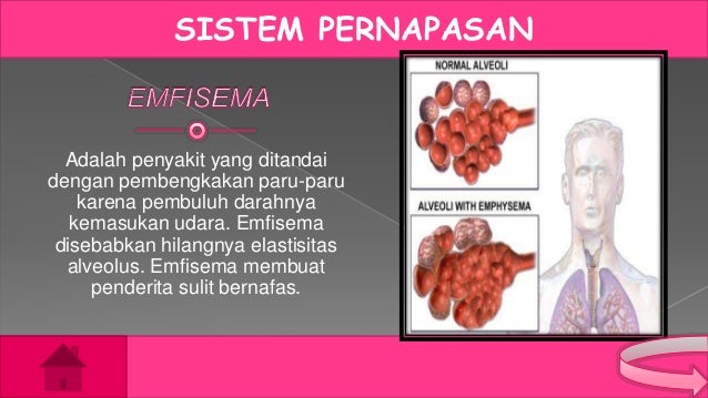 Emfisema adalah penyakit pada paru-paru yang ditandai dengan pembengkakan pada paru-paru karena pembuluh darahnya kemasukan udaraEmfisema disebabkan hilangnya elastisitas alveolus. Orang yang mengalami kelainan penyumbatan saluran pernapasan yang disebabkan oleh alergi debu bulu atau perubahan cuaca berisiko besar terkena penyakit asma. - Kata Tanya Apa.