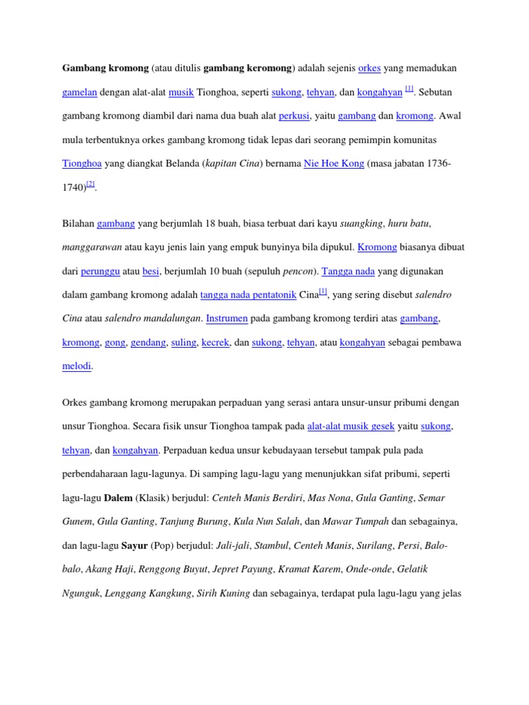 Tangga nada yang digunakan dalam gambang kromong adalah. Instrumen pada gambang kromong terdiri atas gambang kromong gong gendang suling kecrek dan sukong tehyan atau kongahyan sebagai pembawa melodi. Tangga nada yang digunakan adalah Mayor dan Minor serta Gregorian. 03052014 Tangga nada yang digunakan dalam gambang kromong adalah tangga nada pentatonik China sering disebut Salendro Cina atau Salendro mandalungan.