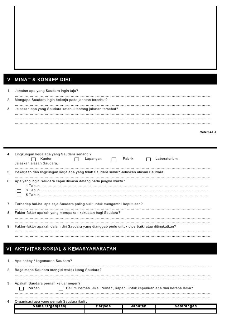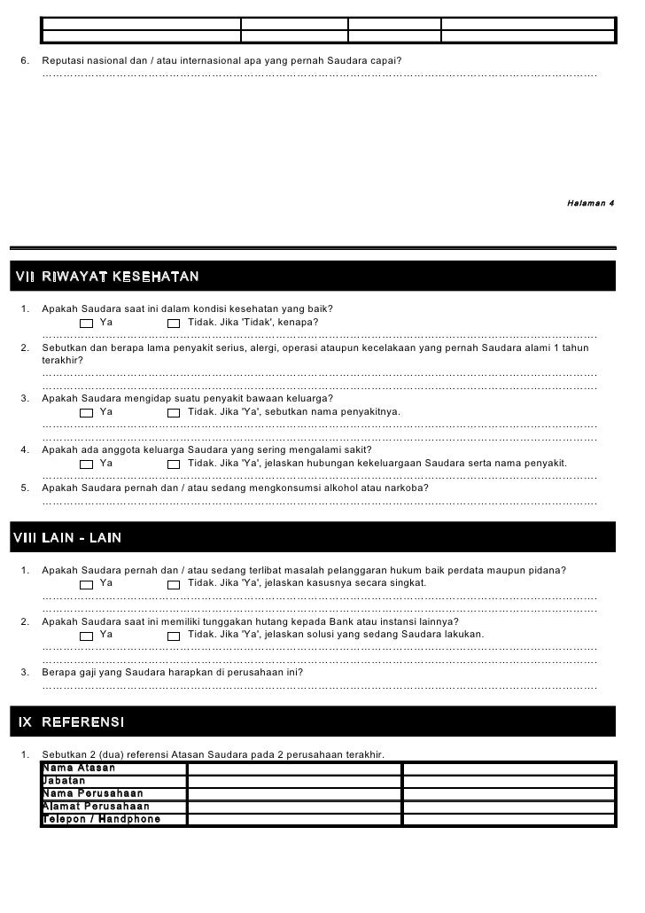 Data keluarga calon pelamar. Identitas diri Pada bagian ini berisi tentang identitas diri dari si pelamar berupa nama lengkap tempat dan tanggal lahir alamat pendidikan terakhir serta dapat ditambah beberapa keterangan lainnya yang dibutuhkan. Riwayat pekerjaan bila ada.