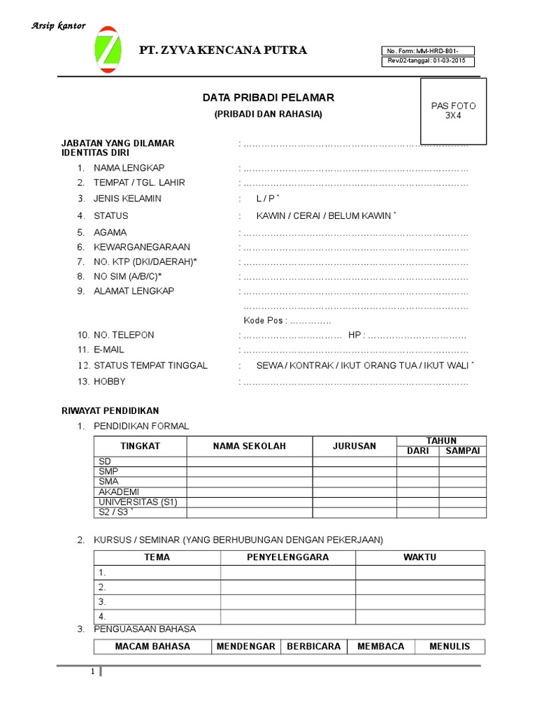 Form Identitas Diri Calon Karyawan 1 Pdf