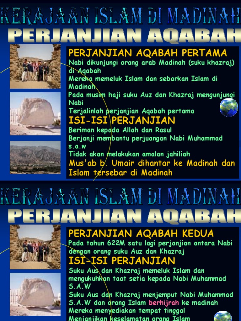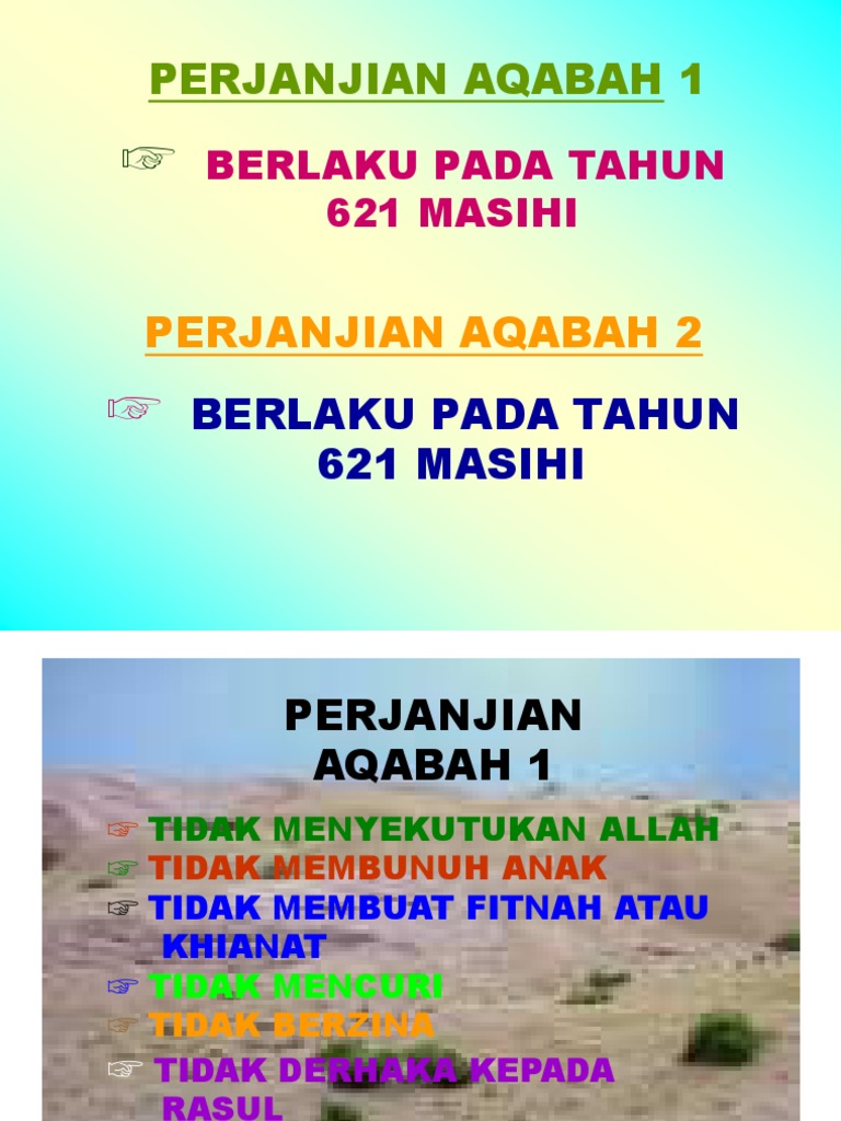 Sejarah perjanjian aqabah II pada 622 SM dilakukan oleh Nabi Muhammad SAW terhadap 73 orang pria dan 2 orang wanita dari Yastrib diwaktu tengah malam. Aus dan Khazra akan beriman k d Allah dan Rasul Membantu perjuangan Nabi Muhammad s. Mereka menyatakan tidak akan menyekutukan Allah SWT.